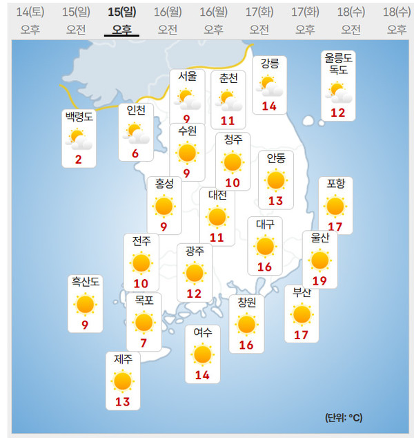15일(일) 아침최저기온은 -2~6℃, 낮최고기온은 11~17℃가 되겠다.