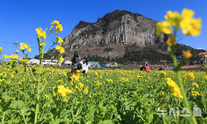 [서귀포=뉴시스] 우장호 기자 = 기온이 올라 포근한 날씨를 보인 지난 12일 제주 서귀포시 안덕면 산방산 인근에 봄의 전령 유채꽃이 활짝 피어나 상춘객들의 시선을 사로 잡고 있다. 2026.02.12. woo1223@newsis.com |