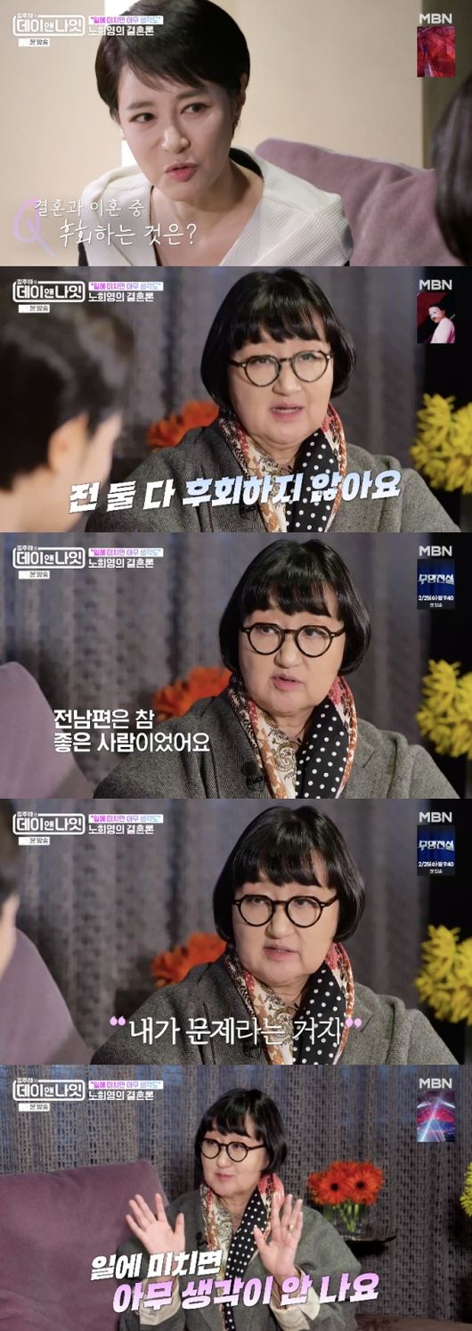 김주하는 “결혼과 이혼 중 후회하는 게 뭐냐”라고 물었고, 노희영은 “둘 다 후회하지 않는다. 결혼해서 행복했고.. 전남편은 참 좋은 사람이었다. 내가 문제다. 저는 결혼에 적합한 사람은 아니다. 일에 미치면 아무 생각이 안 난다”라고 답했다.