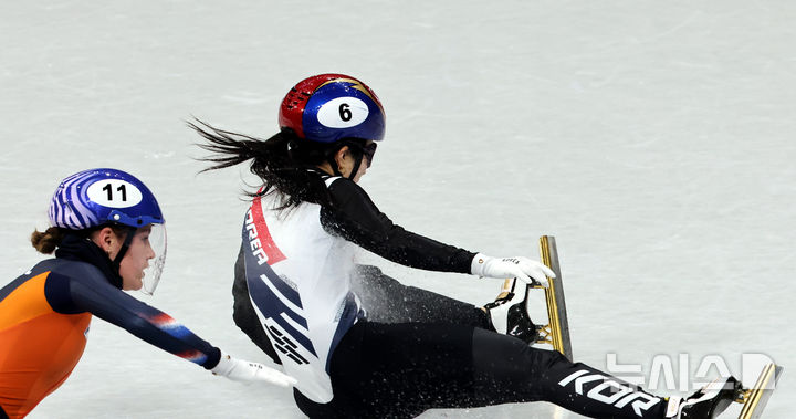 [밀라노=뉴시스] 박주성 기자 = 14일 (현지 시간) 이탈리아 밀라노 아이스 스케이팅 아레나 경기장에서 열린 2026 밀라노·코르티나담페초 동계올림픽 쇼트트랙 여자 1000m 예선에서 김길리가 조1위로 결승선을 통과한 후 네덜란드 선수에게 밀려 넘어지고 있다. 2026.02.15. park7691@newsis.com