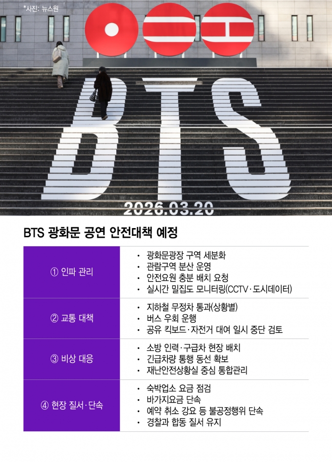 다음달 21일 서울 광화문광장에서 열리는 BTS(방탄소년단) 컴백 공연을 앞두고 정부와 서울시가 대규모 인파에 대비한 종합 안전대책 마련에 나선다. 경찰은 최대 26만명의 인파가 몰릴 것으로 보고 있다. 중앙정부와 지자체, 경찰·소방 등 관계기관이 협력 체계를 구축해 사전 점검부터 현장 대응까지 전방위 관리에 돌입한다.