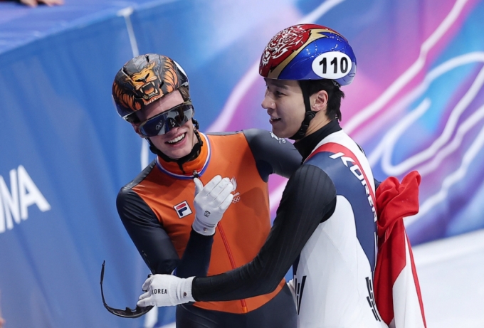 쇼트트랙 황대헌이 14일(현지시간) 이탈리아 밀라노 아이스스케이팅 아레나에서 열린 2026 밀라노·코르티나담페초 동계올림픽 쇼트트랙 남자 1500m 결승에서 은메달을 확보한 후 금메달을 획득한 네덜란드 옌스 판트 바우트와 포옹하고 있다. 2026.2.15/뉴스1 Copyright (C) 뉴스1. All rights reserved. 무단 전재 및 재배포, AI학습 이용 금지. /사진=뉴스1 |