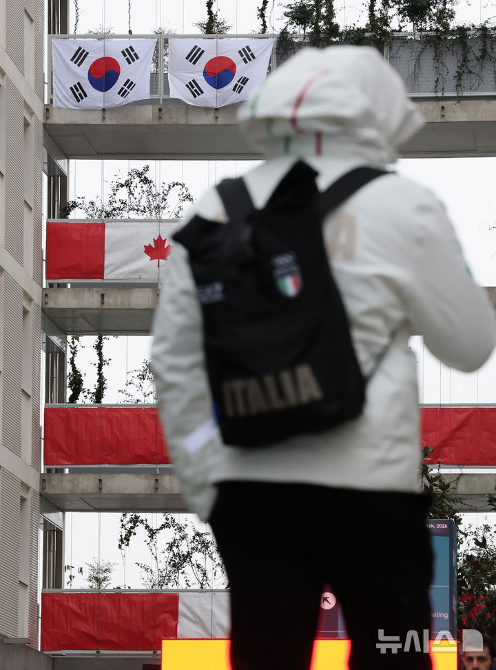 [밀라노=뉴시스] 박주성 기자 = 2026 밀라노·코르티나담페초 동계올림픽 개막을 사흘 앞둔 3일(현지 시간) 이탈리아 밀라노 올림픽선수촌에 태극기가 걸려 있다. 2026.02.03. park7691@newsis.com |