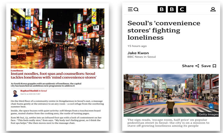 싱가포르 일간 스트레이츠타임스와 중국 관영 신화통신은 서울마음편의점을 비롯해 24시간 무료 상담을 진행 중인 외로움안녕120을 조명했다.