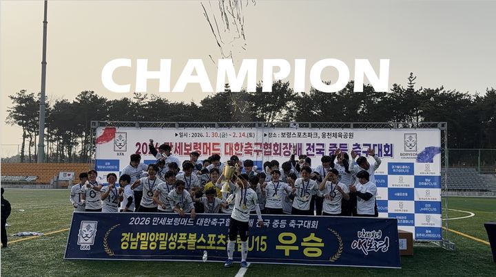 [밀양=뉴시스] 안지율 기자 = 경남 밀양시는 밀양밀성풋볼스포츠클럽 U15가 충남 보령스포츠파크에서 열린 대한축구협회장배 전국 중등 축구대회에서 최종 우승을 차지했다고 15일 밝혔다.