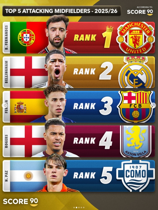 공격형 미드필더 1위는 페르난데스였다. 그의 밑으로는 주드 벨링엄, 페르민 로페스, 모건 로저스 등이 있었다. 페르난데스의 이번 시즌 활약은 대단하다. 리그 23경기에 출전해 6골 12도움을 기록 중이다. 프리미어리그 도움 1위를 압도적인 격차로 유지하고 있으며 찬스 메이킹, 득점력, 빌드업, 세트피스 상황에서의 정확한 킥 등 부족한 부분을 찾기 어려운 수준이다.