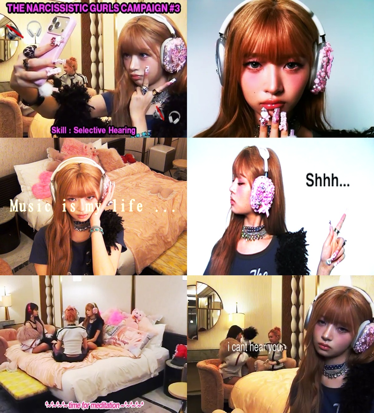 공개된 사진과 짧은 영상에는 두 멤버가 각자의 방식으로 자기애를 정의하는 장면이 담겼다. 먼저 레이는 키치하게 꾸며진 헤드폰과 네일아트가 돋보이는 스타일링으로 트렌디한 무드를 완성했다. ‘Skill : Selective Hearing(선택적 청취)’이라는 자막과 함께 주변의 소란 속에서도 자신의 세계와 음악에 몰입하는 레이의 모습은 타인의 시선이나 상황보다 자신의 내면과 좋아하는 것에 집중하는 주체적인 태도를 드러냈다. 특히 멤버들과 둘러앉아 명상에 집중하는 장면에서는 “나는 그냥 예쁘다. 이유는 없다. 존재가 이유다”라는 나레이션이 더해지며 나르시시즘을 당당한 자기 긍정의 에너지로 풀어냈다.