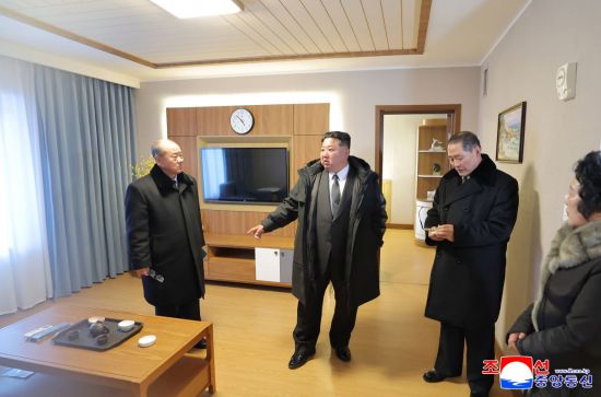 김정은 북한 국무위원장이 지난 20일 경성군 온포근로자휴양소 준공식에 참석해 리모델링 성과를 칭찬하는 모습. 조선중앙tv 연합뉴스 |