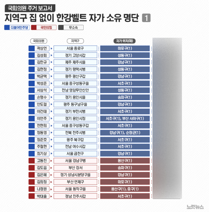 41명 가운데 강남 3구에 주택을 보유한 의원은 30명이었고, 마용성 소재 주택 보유 의원은 11명으로 집계됐다. 국민의힘 신동욱 의원(서울 서초을)은 서울 마포구와 용산구에 각각 주택을 보유한 다주택자로 나타났다.