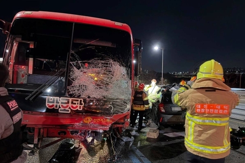이 사고로 승용차 운전자 A(20대) 씨가 숨지고, 버스 승객 18명 중 4명이 다쳐 병원에서 치료받고 있다.