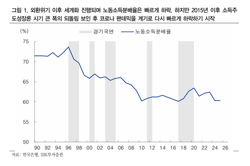 보고서에 따르면 코로나19 팬데믹을 거치면서 2020년을 기점으로 노동소득분배율은 빠르게 하락한 반면, 자본소득분배율은 뚜렷한 상승세를 보이고 있다. 그는 "기술 변화가 인공지능(AI), 로봇, 자동화 등 지식 자본 중심으로 이동하면서 자본투자가 늘어남에도 고용은 오히려 줄어드는 현상이 나타나고 있다"며 "향후 AI의 영향이 반영될 것을 감안하면 노동과 자본의 자금 흐름은 더 가속화될 가능성이 높다"고 내다봤다.