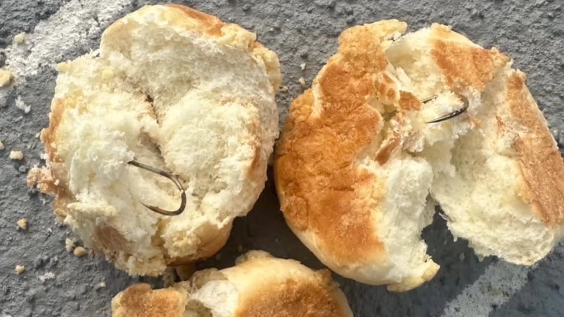 빵 안쪽에 날카로운 금속 낚싯바늘이 박혀 있습니다.