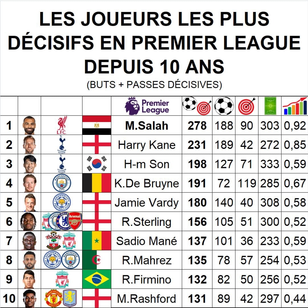 1위는 리버풀 에이스 모하메드 살라였다. 살라는 303경기에서 188골 90도움으로 총 278개의 압도적인 공격 포인트를 기록했다.
