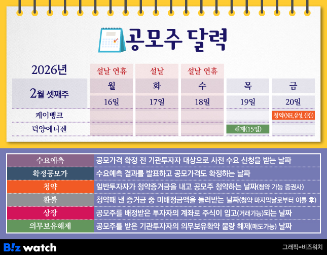 이번 주에는 케이뱅크가 일반 투자자들을 찾아와요. 지난달 상장한 덕양에너젠은 설 연휴 끝나고 기관투자자 의무보유확약 물량이 해제돼요.케이뱅크 공모가, 밴드 하단 8300원 확정