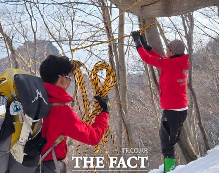 울릉군산악구조대가 성인봉 등반로에 유도로프와 표식기를 설치하고 있다. /울릉군산악구조대 |
