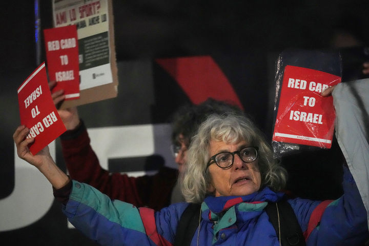 [밀라노=AP/뉴시스] 5일 이탈리아 밀라노에서 시위대가 레드카드를 들고 이스라엘의 2026 밀라노·코르티나담페초 동계올림픽 출전에 반대하고 있다. 2026.02.17. |