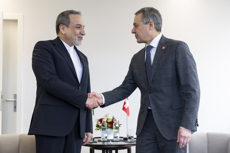 압바스 아라그치(왼쪽) 이란 외교장관이 17일(현지시간) 스위스 제네바에서 이그나치오 카시스 스위스 외교장관을 만나 악수하고 있다. EPA 연합 |