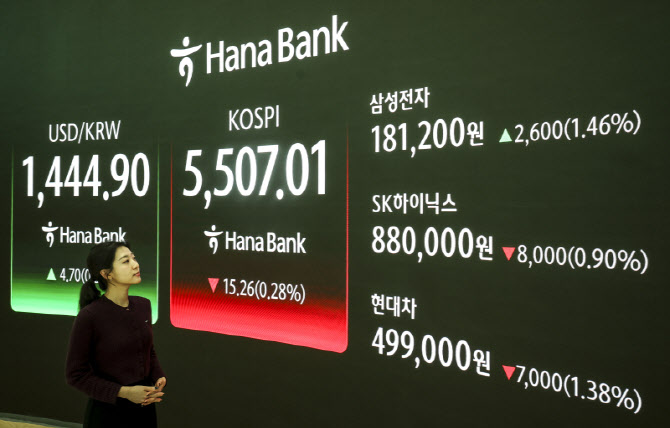 13일 서울 중구 하나은행 딜링룸 전광판에 코스피 등 시황 정보가 나타나 있다. 이날 코스피는 전 거래일(5522.27)보다 15.26포인트(0.28%) 하락한 5507.01에 마감했다. (사진=뉴시스) |