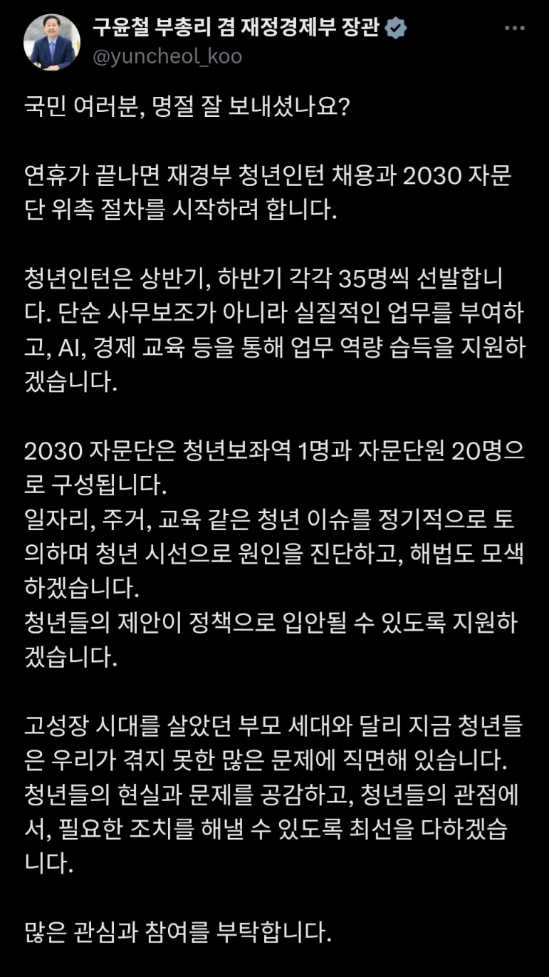 그러면서 “연휴가 끝나면 재경부 청년인턴 채용과 2030 자문단 위촉 절차를 시작하려 한다”며 “청년들의 제안이 정책으로 입안될 수 있도록 지원하겠다”고 설명했다.