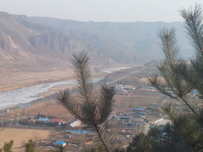 지린성 옌볜자치주 투먼 북중 국경지대에 소재한 조각공원에서 내려다본 북한의 함경북도 온성군 남양시 전경. 강 너머의 민둥산 지역이다./홍순도 베이징 특파원. |
