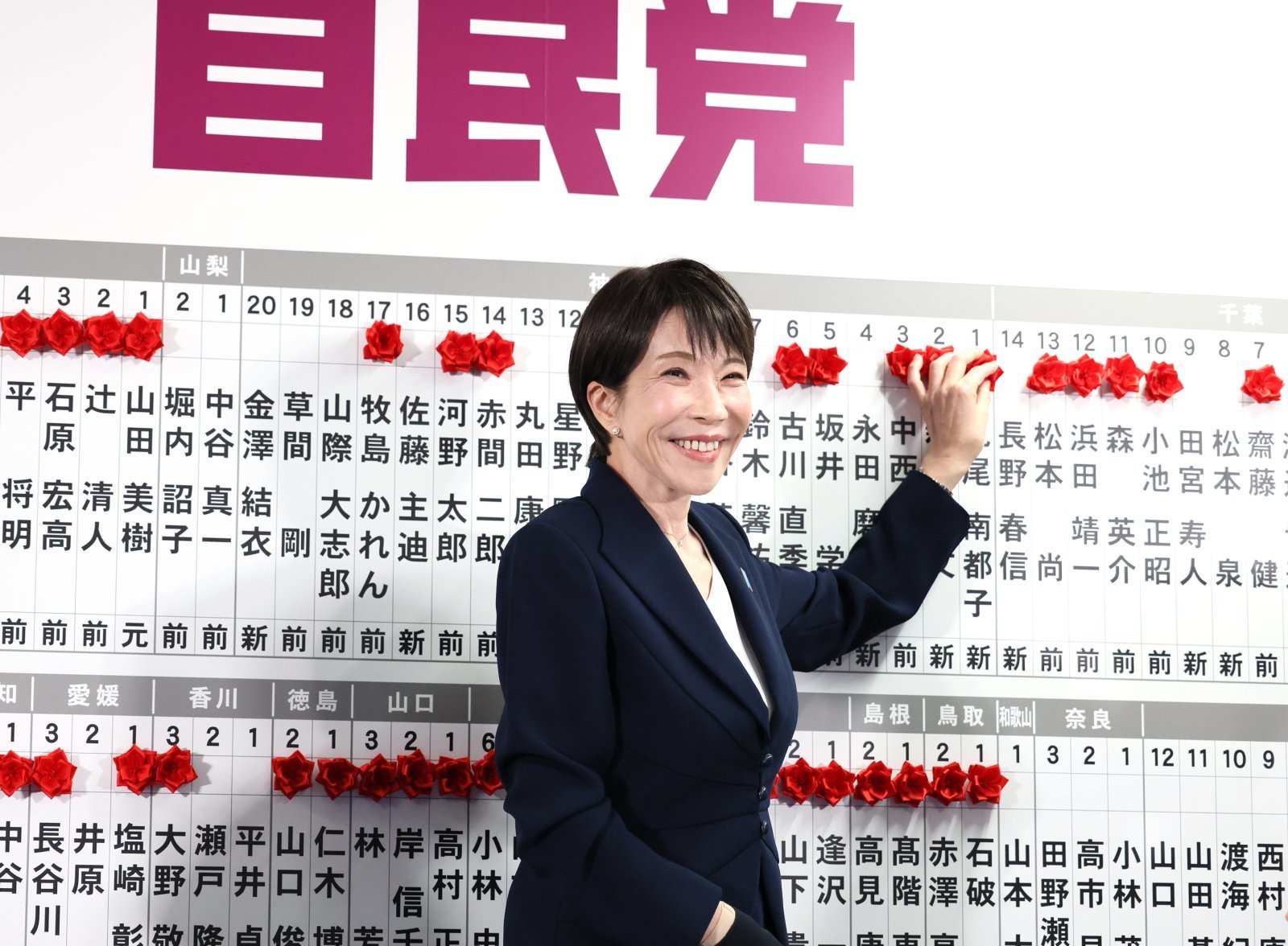 다카이치 사나에 일본 총리가 중의원(하원) 선거가 실시된 8일 도쿄의 자민당 당사에서 승리한 소속 후보들의 이름 위에 붉은 꽃 장식을 달아주며 활짝 웃고 있다. NHK방송에 따르면 자민당은 이날 오후 10시 40분 기준 전체 465석 중 과반(233석) 이상인 256석을 확보했다. 아사히신문 제공 |