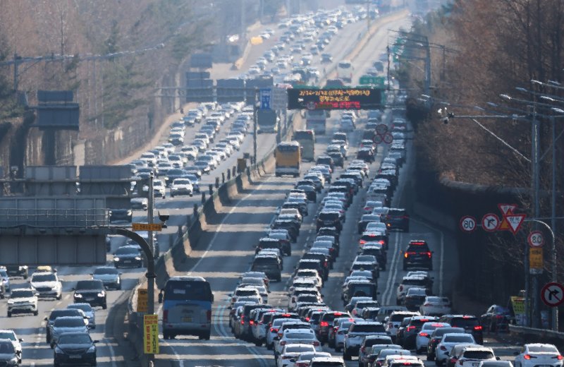 설 연휴 마지막 날인 18일 오후 서울 서초구 잠원IC 인근 경부고속도로 상행선(왼쪽)·하행선 방향 차량들이 서행하고 있다. 뉴스1 |