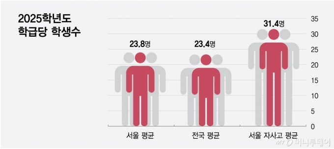 그럼에도 불구하고 자사고 등은 서울시내 일반고보다 평균 인원이 많은 편이다. 지난해 4월 기준 서울 시내 고등학교 학급 당 학생 수는 평균 23.8명이다. 반면 자사고 15곳은 평균 31.4명이다. 서울시내 고등학교 학생 수는 20만3087명으로 5년 전인 2020년 22만4316명보다 9.5%가 감소했는데, 일부 학교만 대규모를 유지한다면 주변 일반고는 더 빠르게 소형화될 우려가 있다.