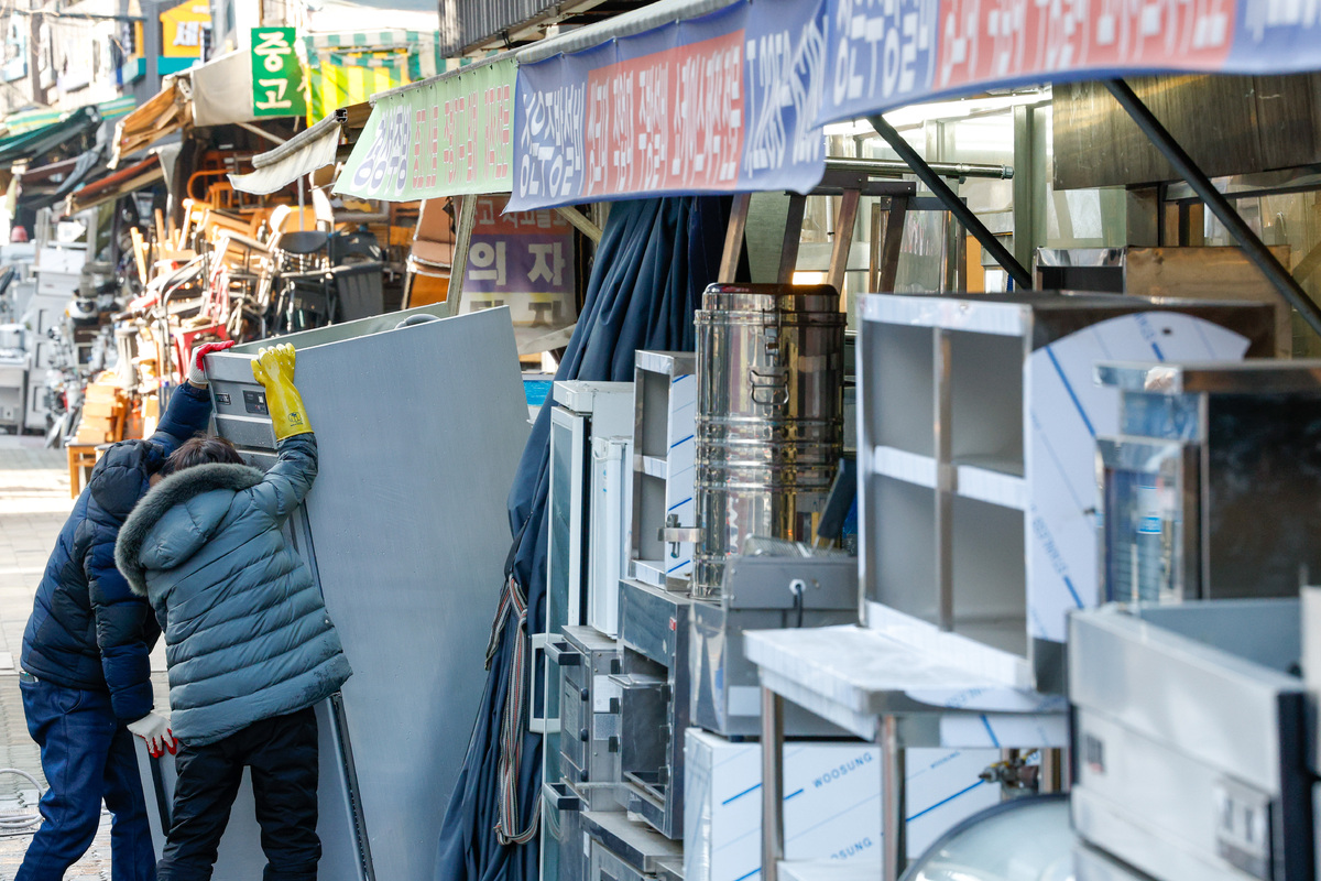벼랑 끝 자영업자 내수 부진과 고금리가 이어지면서 자영업자들의 어려움이 커지고 있는 가운데 18일 서울 중구 황학동 주방거리에 중고 주방물품들이 쌓여 있다. 자영업자 대출 차주 중 3개월 이상 대출 상환을 연체한 금융채무 불이행자 수는 최근 5년 사이 3배 이상 늘어났다. 유희태 기자 |