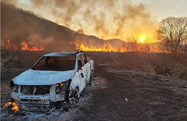 불은 하천 주변 10㏊ 내 갈대와 나무, 승용차 1대 등을 태웠다. 다만 불은 인근 야산으로 번지지 않았고 인명 피해도 없었다.