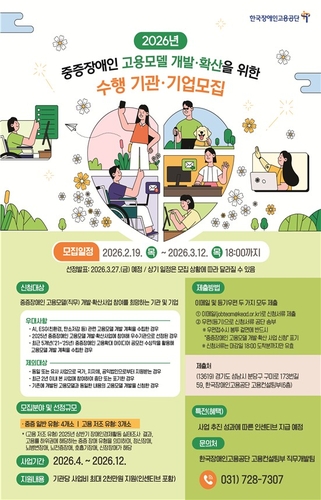 (서울=연합뉴스) 김은경 기자 = 한국장애인고용공단은 취업 취약계층인 중증장애인의 지속 가능한 일자리 창출을 위해 '2026년 중증장애인 고용모델 개발·확산 사업'에 참여할 기업 및 기관을 모집한다고 19일 밝혔다.
