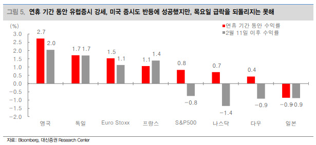 이 같은 여건 속에 연휴 기간 유럽 증시는 강세를 보였고 미국 증시도 반등에 성공했지만, 주중 급락분을 모두 만회하진 못했다. 다만 반등을 이끈 업종은 반도체·IT 하드웨어와 내수주, 금융주였고 소프트웨어 부진은 이어졌다는 점이 특징으로 꼽혔다.