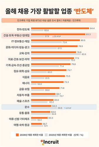 19일 HR테크기업 인크루트가 873개 기업(대기업 102곳·중견기업 122곳·중소기업 649곳)을 대상으로 '2026 업종별 채용 계획'을 조사한 결과, 올해 대졸 신입사원 채용이 가장 활발할 것으로 예상되는 업종은 전자·반도체(84.4%)였다. 전년 대비 23.8%포인트 상승한 수치다.