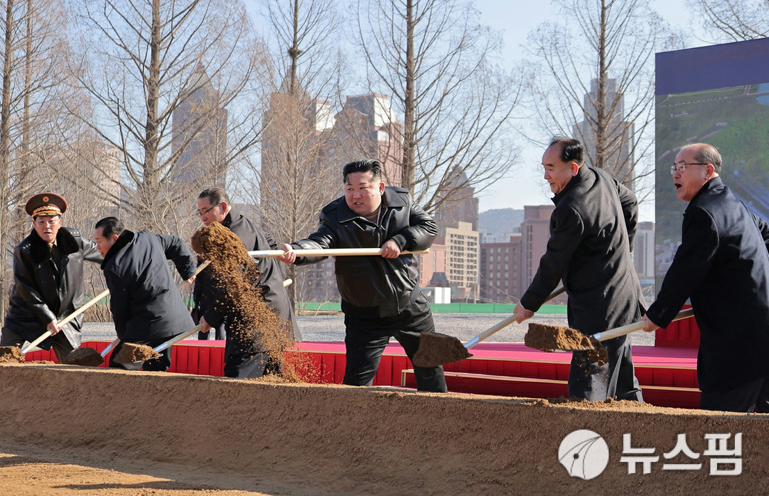 [서울=뉴스핌] 이영종 통일북한전문기자 = 북한 국무위원장 김정은(오른쪽 세번째)이 18일 평양에 조성 중인 대규모 주택단지인 화성지구 5단계 착공식에 참석해 첫 삽을 뜨고 있다. 왼쪽부터 노광철 국방상, 박정천 노동당 중앙군사위 부위원장, 박태성 총리, 김정은, 조용원 당 조직담당 비서, 리일환 당 정치국 위원. [사진=북한매체 종합] 2026.02.19 yjlee@newspim.com |