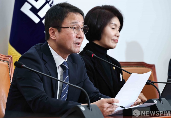 [서울=뉴스핌] 윤창빈 기자 = 한병도 더불어민주당 원내대표가 19일 서울 여의도 국회에서 열린 정책조정회의에서 모두발언을 하고 있다. 2026.02.19 pangbin@newspim.com