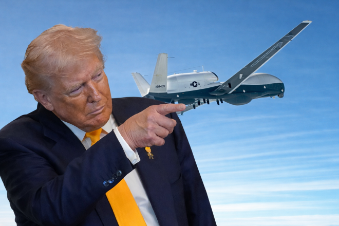 도널드 트럼프 미국 대통령이 18일(현지시간) 워싱턴 백악관 이스트룸에서 열린 흑인역사기념월 행사에서 발언하며 손짓하고 있다. 배경에는 노스럽그러먼의 다중정보(Multi-Int) MQ-4C 트라이톤 고고도 정찰 드론 이미지를 합성했다. AP 연합뉴스·노스럽그러먼 |