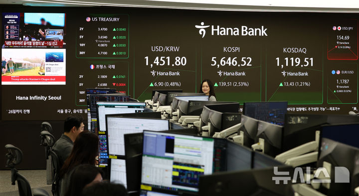 [서울=뉴시스] 이영환 기자 = 코스피가 전 거래일(5507.01)보다 135.08포인트(2.45%) 오른 5642.09에 개장한 19일 오전 서울 중구 하나은행 딜링룸 전광판에 지수가 표시되고 있다.코스닥 지수는 전 거래일(1106.08)보다 16.12포인트(1.46%) 오른 1122.20, 서울 외환시장에서 원·달러 환율은 전 거래일 주간거래 종가(1444.9원)보다 6.1원 오른 1451.0원에 출발했다. 2026.02.19. 20hwan@newsis.com |