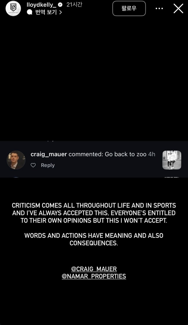 경기 후 한 팬은 이런 활약에 도를 넘은 비판을 가했다. SNS상에서 켈리를 향해 '동물원으로 돌아가라(Go back to the zoo)'고 말한 것. 이에 켈리는 직접 "비판은 삶의 일부이자 스포츠의 일부이며 나는 항상 받아들여 왔다. 누구나 자신의 의견을 가질 권리가 있다. 하지만 이건 받아들일 수 없다. 말과 행동에는 의미와 결과가 있다"고 답하면서 강경 대응을 예고했다.