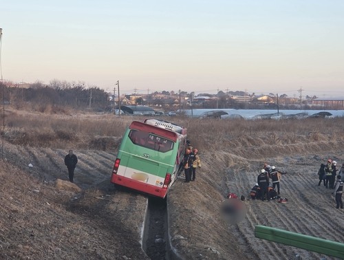 이날 오전 6시 57분께 익산시 금마면의 한 논길에서 회사 통근버스가 추락해 운전기사(70대)가 숨지고 회사원 20명이 다치는 사고가 났다.