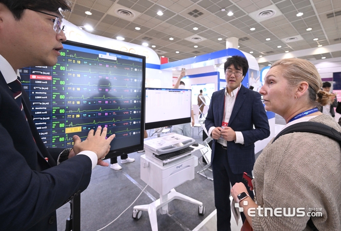 병원 및 헬스테크 산업 전문 박람회인 2024 국제 병원의료산업 박람회가 대한병원협회 주최로 2일부터 서울 삼성동 코엑스에서 열렸다. 씨어스 부스에서 참관객이 입원환자 무선 모니터링 솔루션에 대한 설명을 듣고 있다. 박지호기자 jihopress@etnews.com |