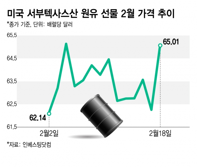 중동 긴장감이 높아지면서 국제유가는 오르고 있다. 18일 뉴욕상업거래소에서 3월 인도분 서부텍사스산유(WTI)는 4.59% 급등한 65.19달러에 거래됐다. 안전자산으로 꼽히는 금 현물 가격은 2.22% 올라 온스당 4985.46달러를 기록했다.