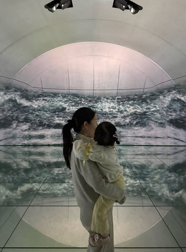 공개된 사진에는 이다인과 가족들의 화목한 모습이 담겨 있다. 한 미디어 아트 전시관을 찾은 두 사람은 딸과 함께 작품을 관람하고 있다.