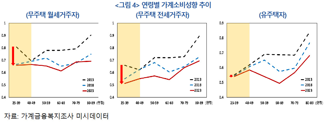통상 집값이 오르면 가계의 자산가치가 높아져 씀씀이도 커져야 한다. 그러나 한국의 경우 주택가격이 장기간에 걸쳐 상승한 반면 가계소비 증가세는 둔화 양상을 보이고 있다. 한국은행이 가계금융복지조사 미시데이터를 분석한 결과 한국 가계의 가처분소득 대비 소비 비중(평균소비성향)은 특히 40세 미만의 젊은 층, 그 중에서도 무주택 가구에서 하락세가 두드러졌다.