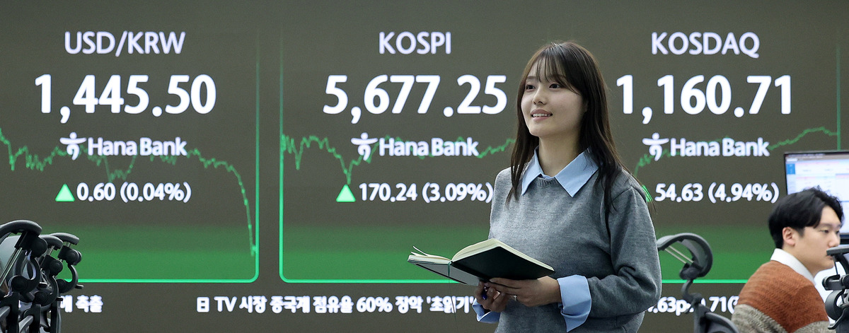 국내증시 동반 상승 랠리 코스피가 사상 최고치로 거래를 마친 19일 오후 서울 중구 하나은행 딜링룸 전광판에 코스피 지수가 전 거래일 종가와 비교해 170.24포인트(3.09%) 상승한 5677.25를 나타내고 있다. 코스닥도 전 거래일 대비 54.63포인트(4.94%) 상승한 1160.71로 마감한 가운데 강한 매수세에 오전 한때 올해 두 번째 매수 사이드카가 발동되기도 했다. 뉴스1 |