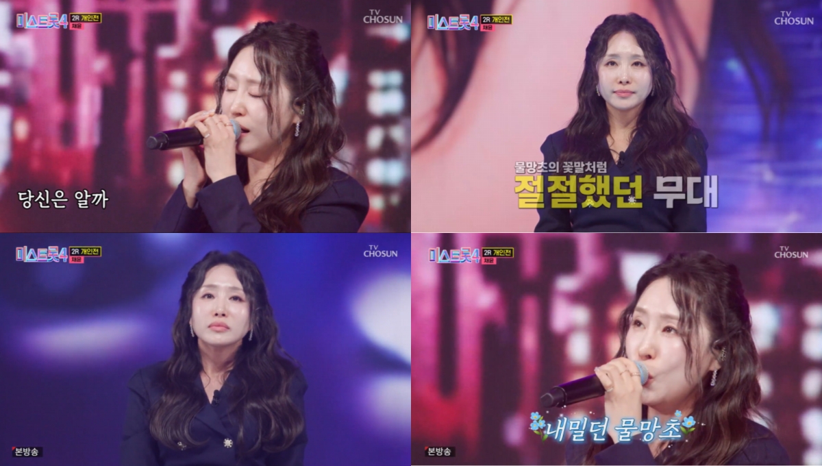 이날 진행된 2라운드 '개인전'에서 채윤은 김용임의 '물망초'를 선곡해 무대를 선보였다. 무대에 앞서 단정한 블랙 원피스를 입고 등장한 그는 "절벽 끝에 있는 것 같다. 오늘 최선을 다해서 꼭 Top10 안에 진입하겠다"며 비장한 각오를 전했다. 이후 애절한 목소리로 곡이 가진 절절함을 극대화시키며 시청자들의 가슴을 울렸다.