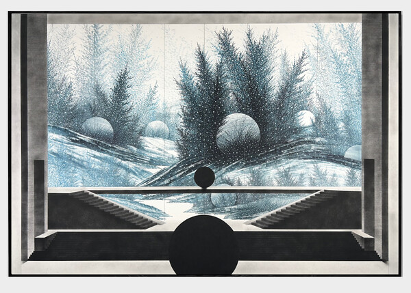 작가의 화면에 등장하는 검은 구체는 현재의 경험과 감정, 사건을 응축한 조형적 단위다. 산수나 건축적 공간 속에 이질적으로 배치된 이 형상은 재현적 풍경의 질서를 교란하며, 색이 옅어질수록 휘발되어가는 기억과 감정의 상태를 드러낸다.