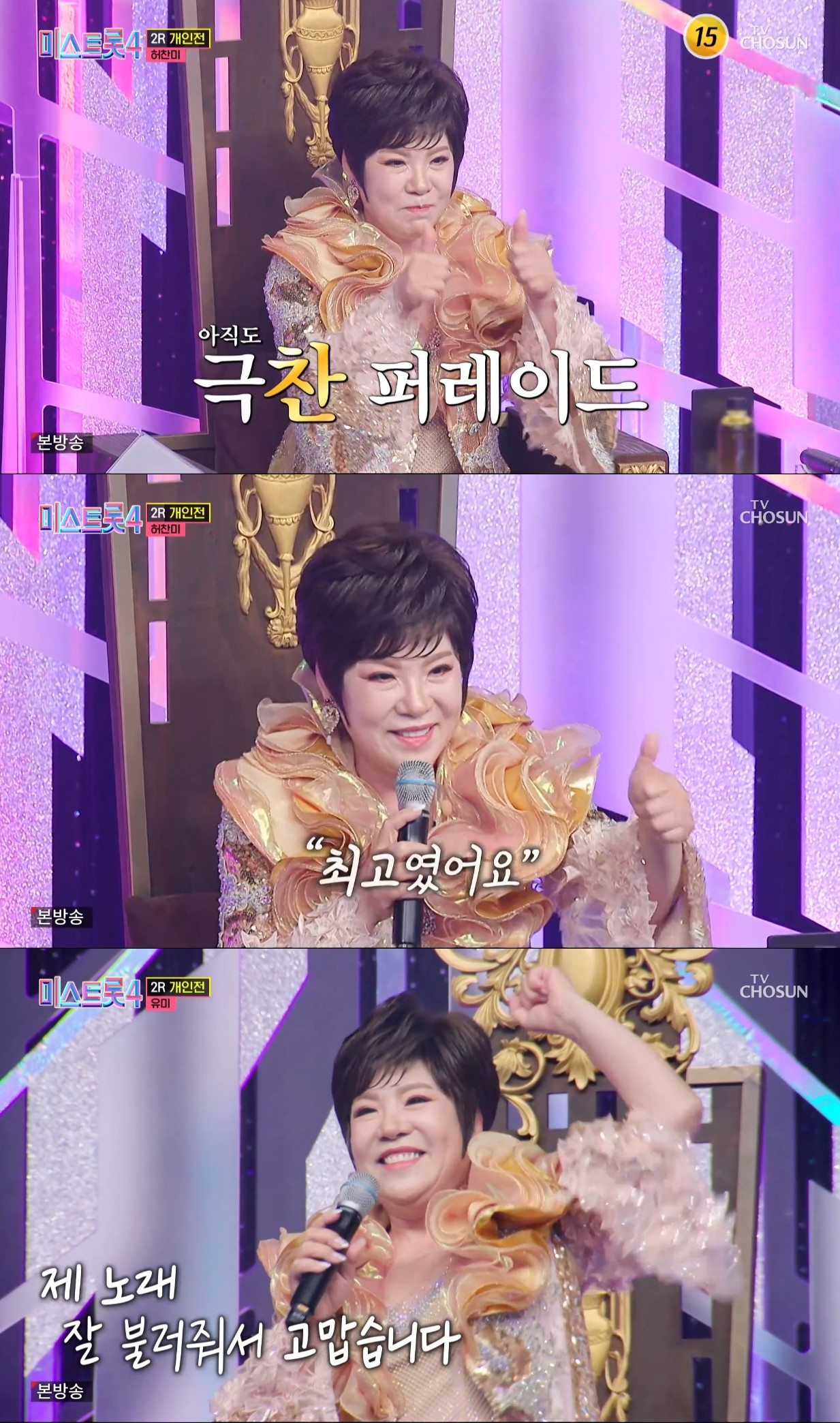 무대가 끝난 뒤 김연자는 울컥한 듯 말을 잇지 못하다가 "허찬미가 퍼포먼스를 굉장히 많이 하는데 제 노래가 퍼포먼스 할 게 많지 않다. 그래서 왜 내 노래로 하냐고 물어보니 사람들의 편견을 깨고 싶어서라고 하더라. 그 말을 들을 때 과연 말과 실천이 될까 싶었고, 좋은 자리에 왔는데 정통을 해서 내려올 필요는 없다고 생각해 걱정했지만 정말 최고였다"고 말했다.