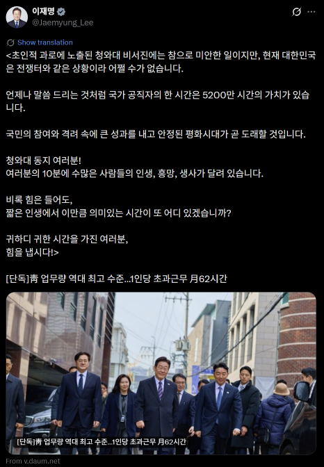 이 대통령은 이날 오전 자신의 사회관계망서비스(SNS)에 본지 기사를 공유한 뒤 이같이 밝혔다. 기사에는 이재명 정부 출범 이후 청와대 직원들이 월평균 62.1시간의 초과근무를 해왔다는 내용이 포함됐다.