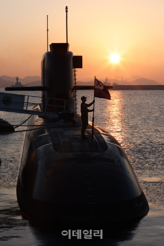 경남 진해 해군잠수함사령부에서 해군 장병이 3000t급 잠수함 3번함 신채호함에 해군기를 게양하고 있다. (사진=노진환 기자) |
