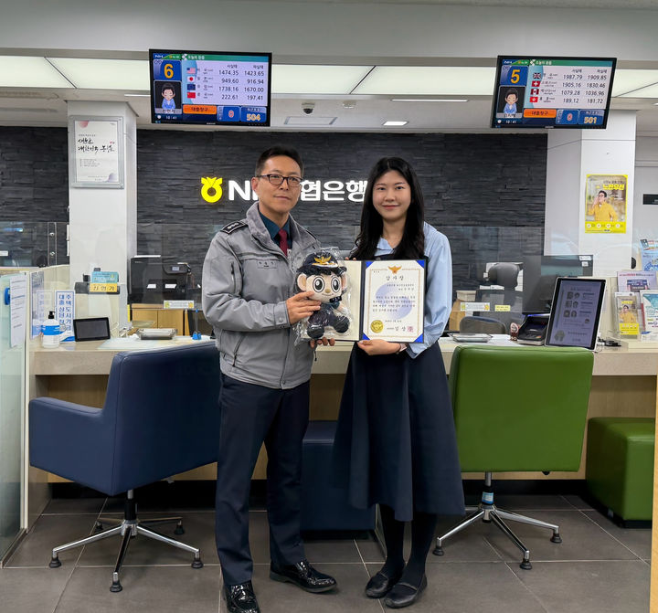 [울산=뉴시스] NH농협은행 울산중앙금융센터(센터장 최원식)는 1억원 상당의 금융사기 피해를 예방한 공로로 진주연 계장이 남부경찰서로부터 표창을 받았다고 20일 밝혔다. (사진= 농협은행 울산중앙금융센터 제공) 2026.02.20.photo@newsis.com *재판매 및 DB 금지 |