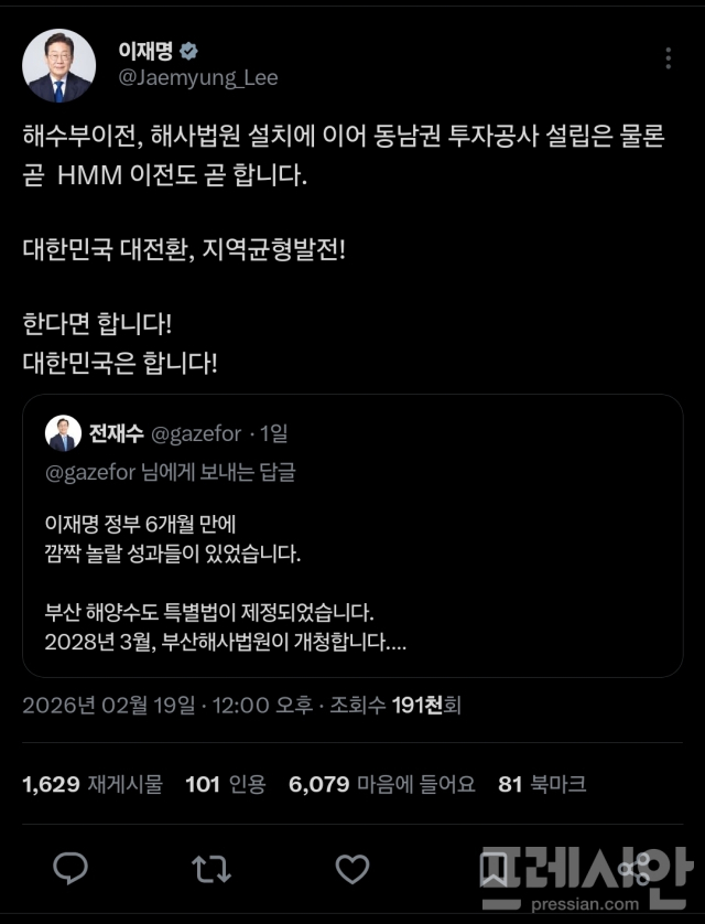 ▲전재수 의원의 글을 인용한 이재명 대통령 SNS.ⓒ이재명 SNS(X) |
